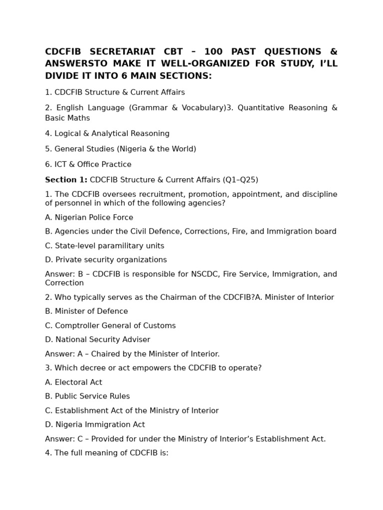 CDCFIB SECRETARIAT CBT – 100 PAST QUESTIONS &