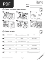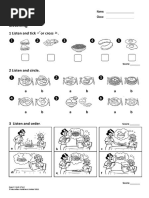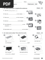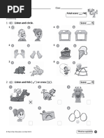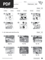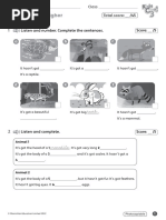 The document uses a variety of assessment strategies to gauge students' understanding, including multiple listening, reading, and speaking exercises. Listening activities involve ticking or circling correct responses based on audio stimuli, testing comprehension and vocabulary identification skills . Reading and writing tasks assess students’ ability to choose correct adjectives or complete sentences with the correct structure, providing scores for each action . For speaking, the focus is on both accuracy and the ability to communicate effectively, with points rewarded for correct pronunciation and dialogue completion, thus measuring fluency and practical language use .