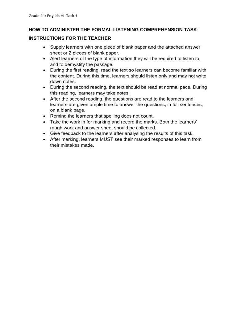 The document provides instructions for administering a formal listening comprehension task for Grade 11 English HL students, including guidelines for reading the text and assessing responses. The listening comprehension text discusses the importance of consistency in achieving success and personal growth, emphasizing that meaningful change occurs through steady effort rather than instant results. Additionally, the document includes a set of questions and a memorandum for marking the students' responses.