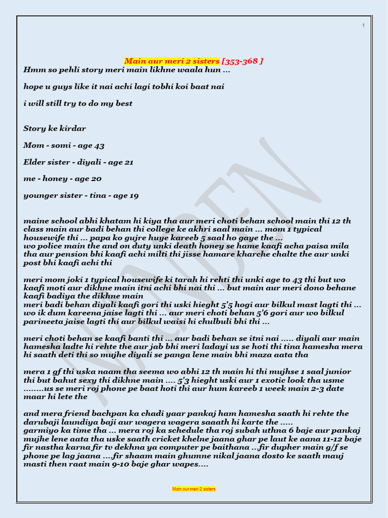 The story introduces the main characters: Honey (the narrator), his elder sister Diyali, younger sister Tina, and mother. Honey had just finished school while Tina was in 12th standard and Diyali in her final year of college. Honey's daily routine involved playing cricket with his friend Pankaj and chatting with his girlfriend Seema. One day, Tina asks Honey to accompany her to the market to buy supplies. There, they run into Diyali who also joins them. Later, Honey gets intimate with Seema at their friend Pankaj's house. He then hangs out with friends before returning home late night.