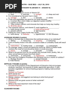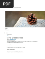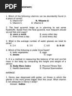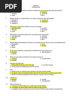 The document contains 15 questions that test knowledge of basic nutrition facts. The questions cover topics like the roles of water, blood, carbohydrates, proteins, vitamins, minerals, and other essential nutrients in the body. They also address healthy habits, sources of various vitamins and minerals, and diseases related to nutrition deficiencies. The final section includes slightly more advanced questions about specific diseases, herbal remedies, nutrition policies, and heart conditions.