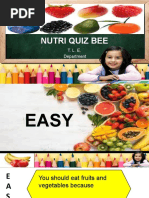 The document contains several quiz bee questions divided into categories for different grade levels. The questions cover topics in nutrition, health, and the human body. They range from easy multiple choice questions to more difficult questions testing in-depth knowledge. The quiz bee is being held by Dumangas Baptist Church and Institute in the Philippines and aims to educate participants about important health and nutrition topics.