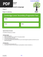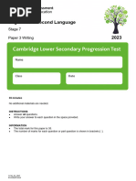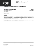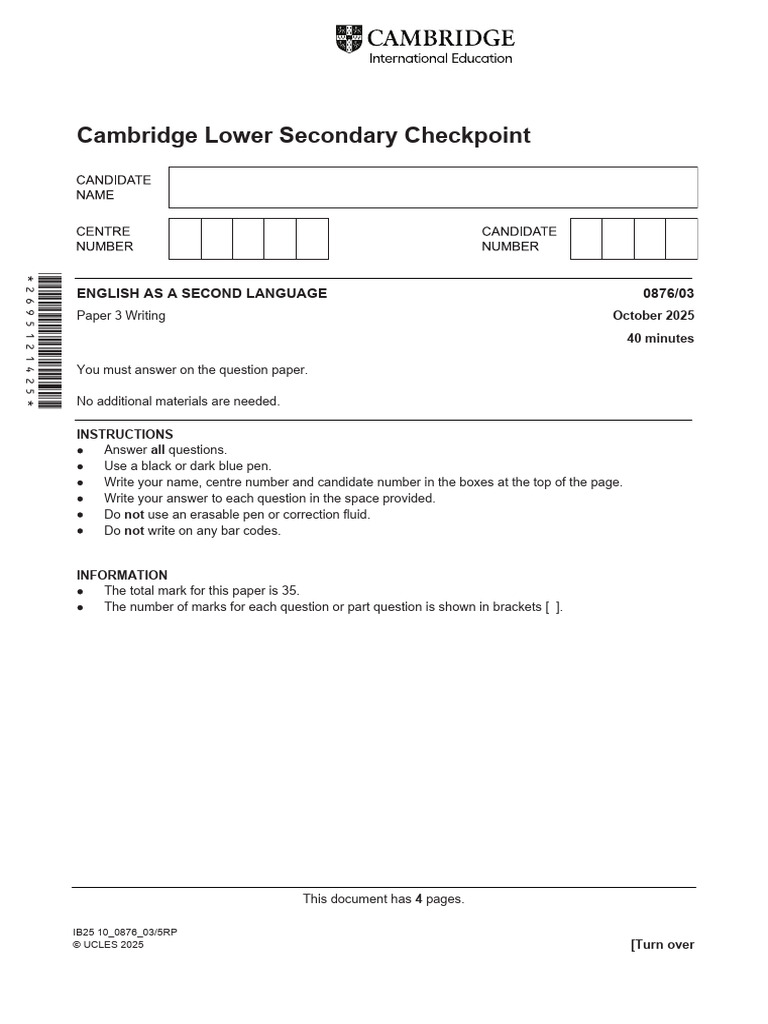 The document outlines the Cambridge Lower Secondary Checkpoint English as a Second Language Paper 3 Writing exam for October 2025, which includes instructions for candidates and two writing tasks. The first task requires writing an email recommending a film to a friend, while the second task is an essay on the necessity of studying foreign languages in school. The total marks for the paper are 35, with specific word counts for each question.